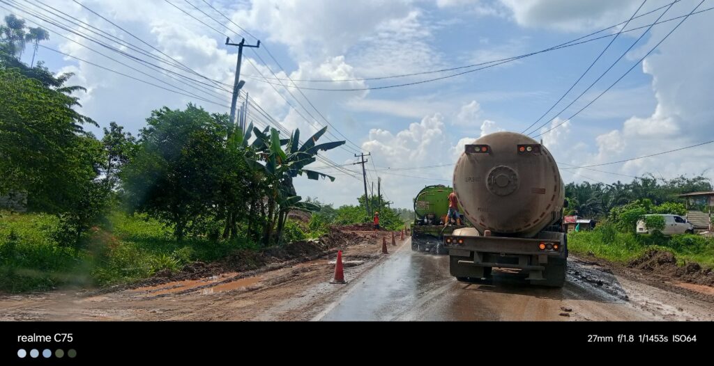 Muba,beritamedianusantara.com- Sejumlah pengendara jalan negara khususnya pengendara roda 2 dan roda 4 melintas diruas jalan lintas Timur Sumatera Selatan tepatnya di Desa Seratus Lapan Kecamatan Babat Supat Kab. Musi Banyuasin (Muba) Provinsi Sumatera Selatan Sumsel, keluhkan dampak dari aktivitas mobilisasi proyek PT HKI.