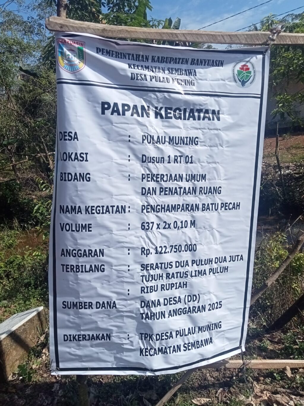 Penghamparan batu pecah di jalan Dusun 1 RT 1 itu dengan volume 637 x 2 x 0,10 meter dan dialokasi dananya Rp 122.750.000,-