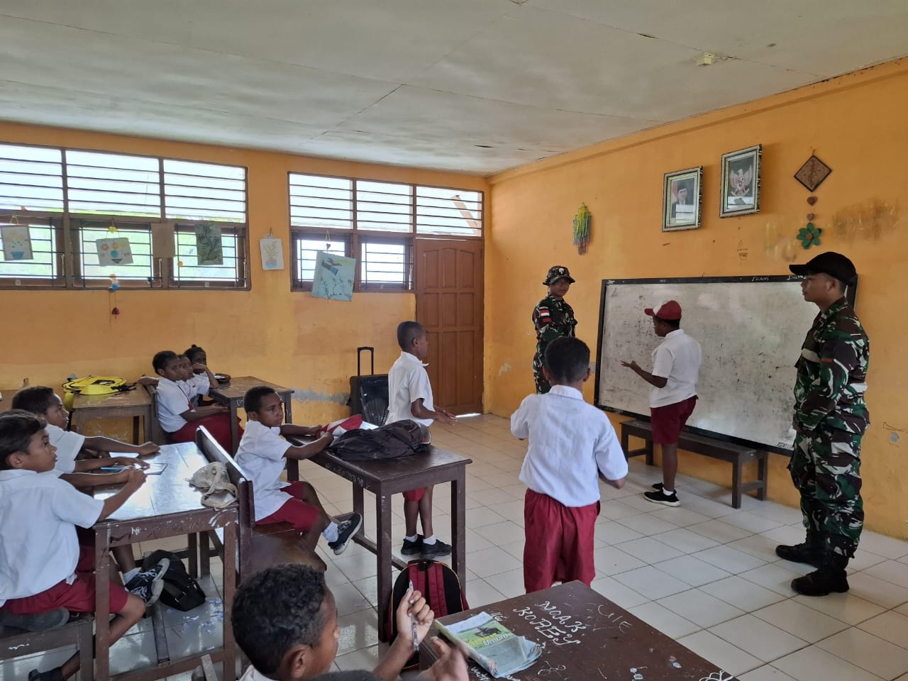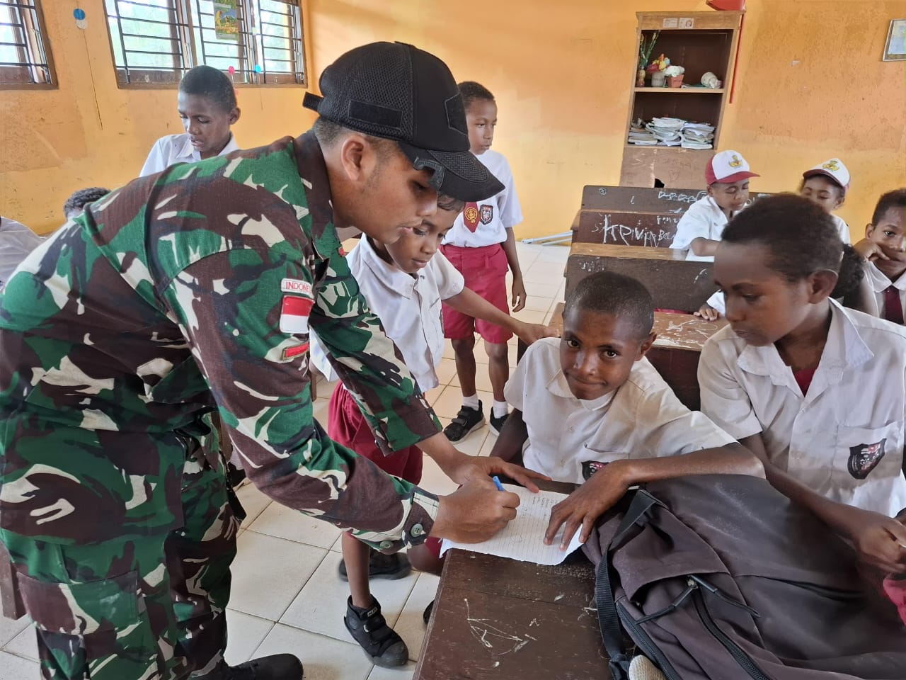 Anak-anak pun terlihat antusias dan senang belajar bersama para prajurit. Dengan penuh semangat, mereka menyimak pelajaran sambil sesekali tersenyum dan bercanda riang.