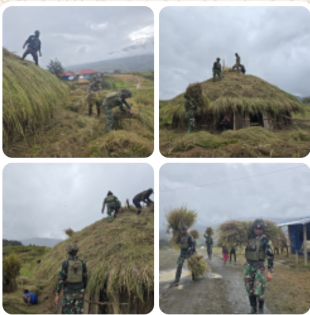 Di tengah rerumputan basah dan lembah yang senyap, terlihat prajurit loreng hijau terus bahu-membahu bersama warga. Mereka tak hanya menenteng senjata, tapi juga mengangkat rumpun alang-alang, naik ke atap dan menyusun jerami dan nata ulang kebesaran budaya Papua. Dipimpin oleh Sertu Ismail, para personel Satgas bergerak lincah, bukan dalam formasi tempur, tetapi dalam formasi kemanusiaan.
