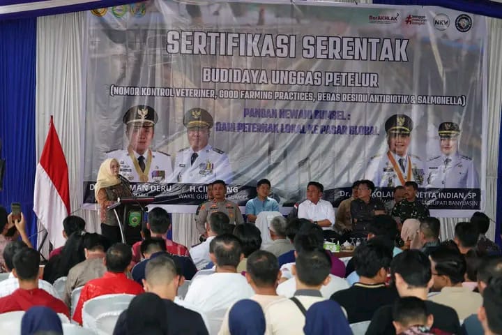 Deklarasi Sertifikasi Nomor Kontrol Veteriner (NKV), Good Farming Practice (GFP), Serentak Budidaya Unggas Banyuasin Petelur, yang bebas residu antibiotik dan Salmonela ini, dilaunching sekaligus diserahkan langsung secara simbolis kepada para pengusaha ternak unggas petelur, oleh Gubernur Sumatera Selatan Dr. H. Herman Deru, SH MM, bersama dengan Wakil Bupati Banyuasin Netta Indian, SP yang dipusatkan di Jl. Sangaji Dusun II Desa Pulau Kec. Sembawa, Kabupaten Banyuasin Kamis (11/9/2025).