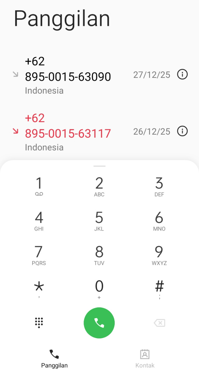Banyuasin,beritamedianusantara.com- Diduga akan melakukan penipuan lewat jaringan telekomunikasi si pelaku usaha menghubungi yang pertama memakai nomor 62895- 0015-63117 pada tanggal 26-12-2025 kemudian menghubungi lagi dengan nomor 62895-0015-63090 pada tanggal 27-12-2025.
