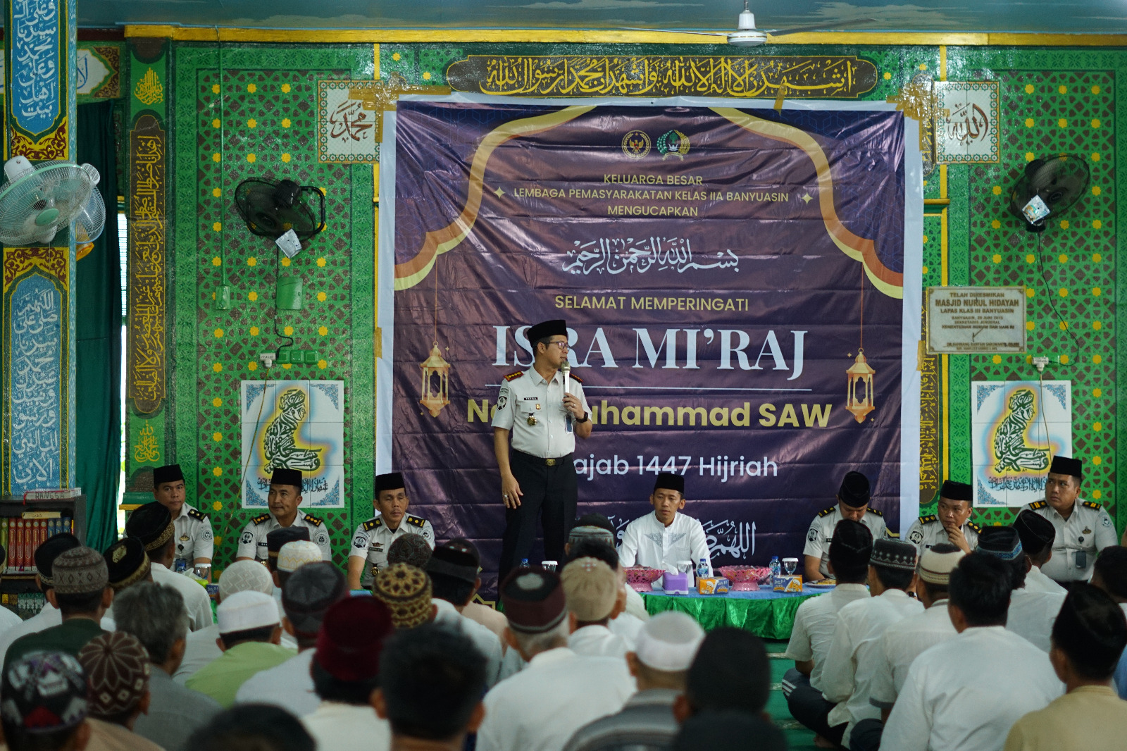 Kepala Lapas Kelas IIA Banyuasin, Tetra Destorie, yang intinya menyampaikan peringatan Isra Mi’raj merupakan salah satu momentum yang sangat penting untuk meningkatkan keimanan dan ketakwaan, khususnya bagi warga binaan.